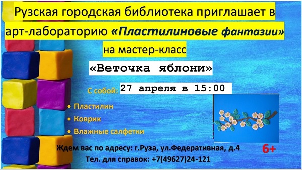 В арт-лаборатории «Пластилиновые фантазии» Рузской городской библиотеки 27 апреля в 15 часов состоится мастер-класс «Веточка яблони».